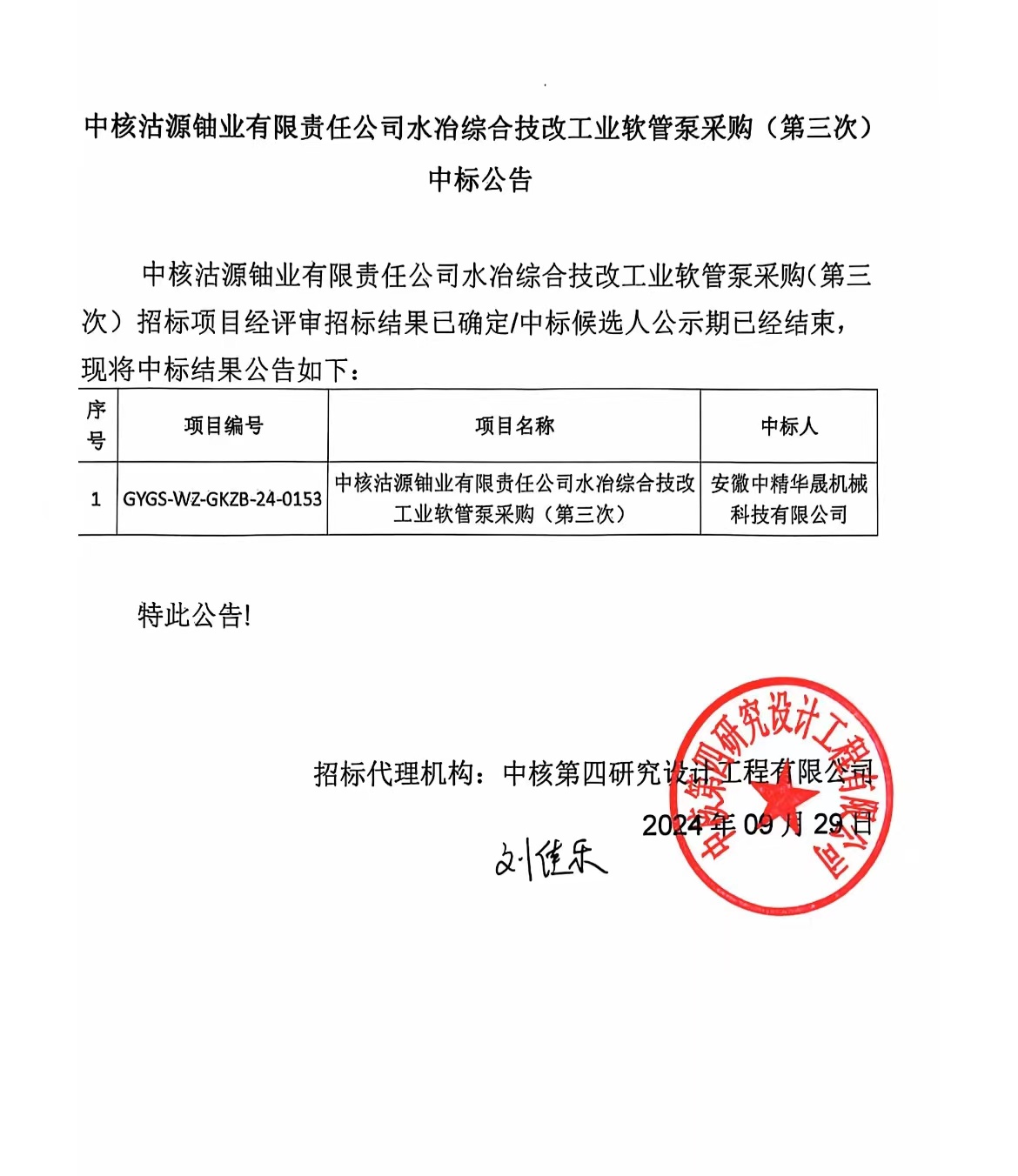 大家好!非常高興地向大家宣布,我司2024929成功中標了中核沽源鈾業有限責任公司水冶綜合技改工業軟管泵采購(第三次)項目。首先,我要向所有參與項目投標的同事們表示熱烈的祝賀和衷心的感謝,是你們的辛勤付出、智慧和團結精神,才使我們在激烈的競爭中脫穎而出,成功中標了這個重要項目。對于我司的發展具有重要的意義。中標該項目不僅能夠增強我司在市場的競爭力,提升品牌形象,而且能夠帶動相關產業的發展促進整個行業的進步。
